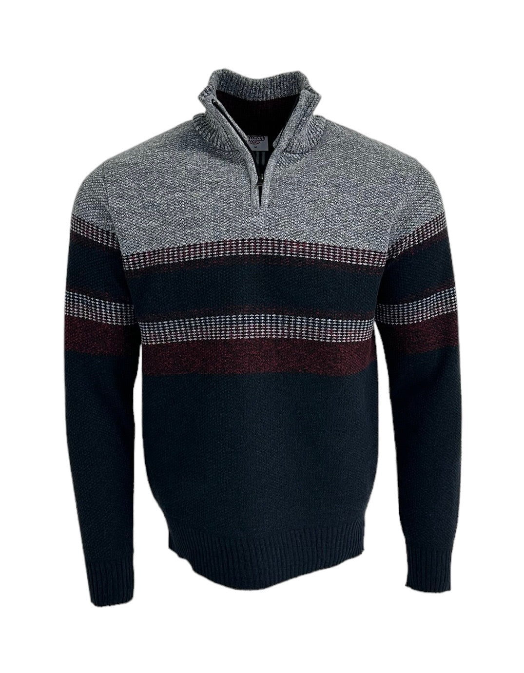 Meet your new go-to layer: our cozy quarter-zip sweater that effortlessly blends textured knits with bold horizontal stripes in rich burgundy, cool grey, and classic black for a look that’s both timeless and fresh. With its comfy mock neck, ribbed cuffs and hem, and just the right amount of polish, this sweater brings that “I just threw this on and still look great” energy. Whether you’re layering up for a crisp morning coffee run or dressing it up for dinner plans, it’s the perfect mix of comfort and style. Offered in two versatile colour combos, this one’s ready to play the long game in your seasonal lineup!