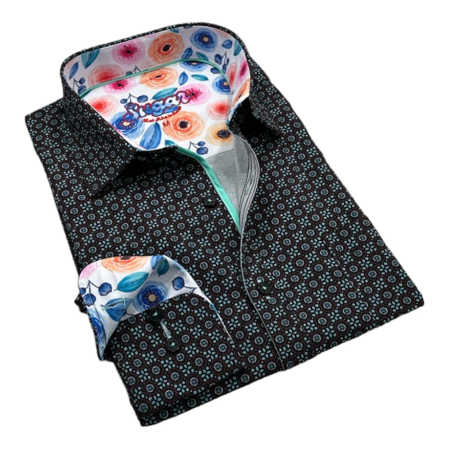 Spin your style into high gear with this intricately detailed rotary print shirt that’s all about movement, charm, and a touch of mystery. With its hypnotic pattern and sharp design, this shirt brings a fresh twist to classic cool. The contrasting inner collar and cuff add an unexpected pop—perfect for when you roll up your sleeves and let your outfit do the talking. Whether you’re out to impress or just keeping your fashion game finely tuned, this shirt keeps your look turning heads in all the right ways.